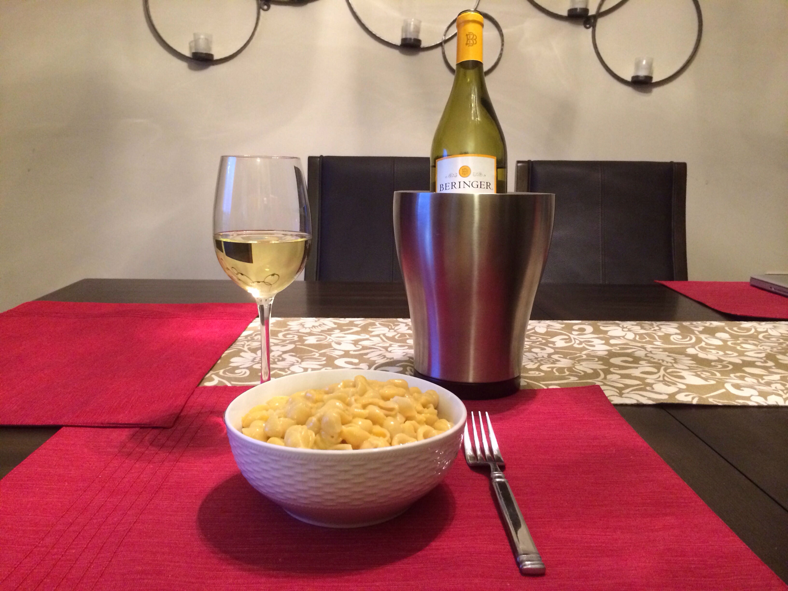 My Grandma Gudgel used to make macaroni using Velveeta, and though I never learned her secret, the Kraft prepackaged version became a favorite of mine in college, and is good enough to elicit a certain degree of nostalgia every time. As far as wine was concerned, I knew I wanted something with only moderate acid and light body to go with the creamy Velveeta cheese, so a Chardonnay sounded like a decent idea. Berringer’s 2012 runs $5.99 at Target, the same place I bought the shells n’ cheese. Sonja and I both generally prefer French-style Chardonnay, which is crisper and rarely if ever aged in oak, versus the tradition Napa-style which is buttery, oaky, and pretty in-your-face. For that reason, this was a good Chard for me; it’s not oaky, a little buttery maybe, yet still crisp with evident flavors of apple and citrus. I used Vivino to check out a couple different whites this night; Berringer ranked higher than almost any other Chardonnay at Target, including some of the more expensive ones. All things considered, it was a nice glass of wine to accompany my nostalgia-laden dinner, and at $5.99/bottle, my only regret about this meal was not having Sonja here to share it with.