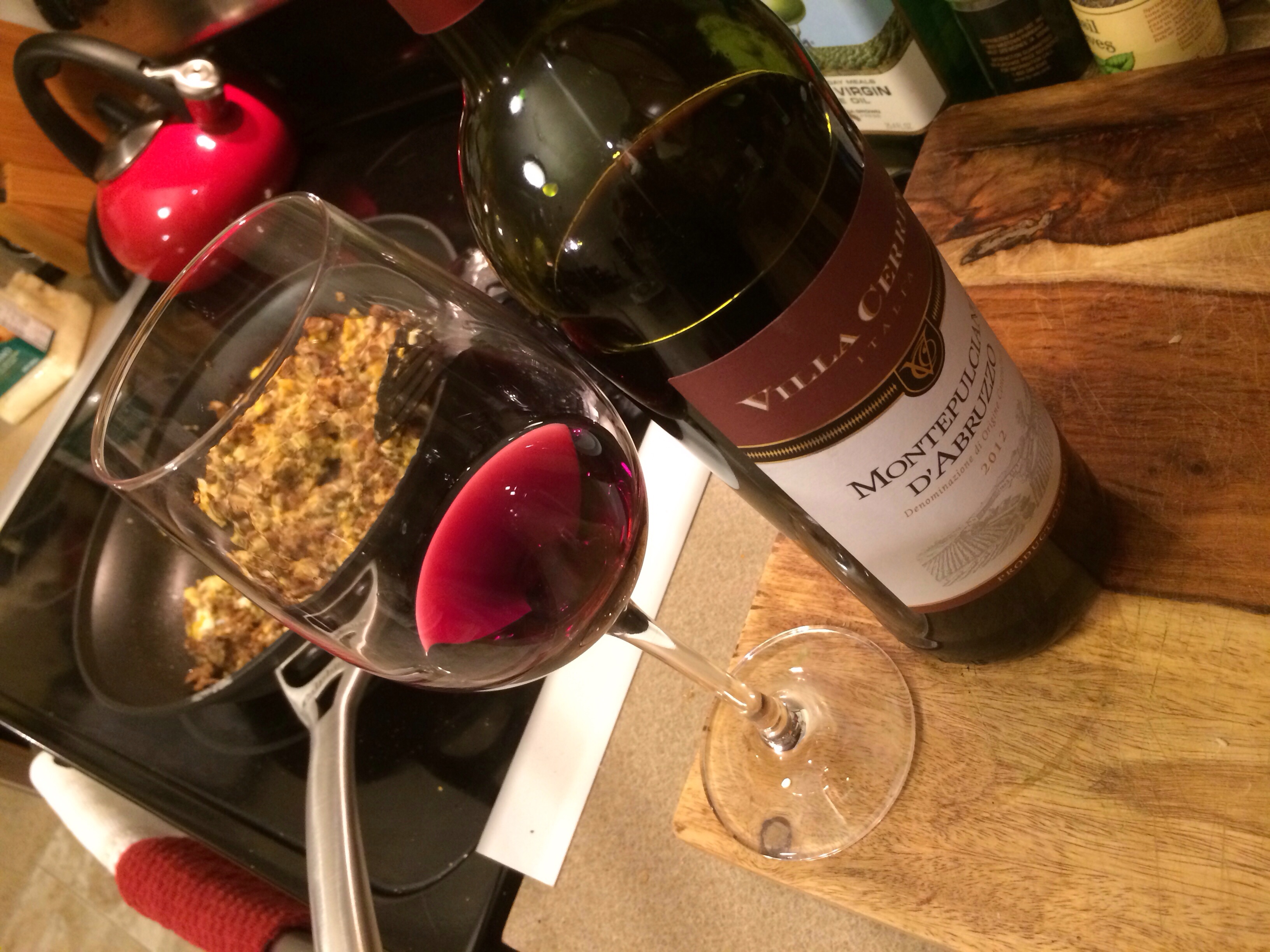 What do you need to offset the punch of rooster juice? An artful balance of fruit and tannin with only hints of acid is a good place to start. Available at Trader Joe’s for a meager $4.99, Villa Cerina (winery) Montepulciano (grape) d’Abruzzo (wine region in Italy) has been a winner in Sonja and my book since we first tried it at the home of our friends Gerald and Stas. Gerald lived in Italy for many years, so we trusted him, and we were right to do so. The wine has gorgeous color and a sweet-yet-not-too-sweet bouquet, and reminds me a little of a Pinot Noir. But while I wouldn’t drink most $5 Pinot Noirs with someone else’s mouth, this wine drinks way out of it’s price range. Best of all, it can stand alone without any problem, so I had a glass while I made the chorizo and another with dinner. As much as I’d have enjoyed sharing this meal with Sonja, she told me she went to Cooper’s Hawk for dinner tonight, so I think she’s just fine.