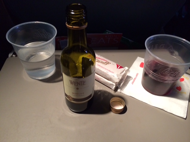 Not unlike United, Delta offers a very limited selection. According to the stewardess, there was one red, and one white. (Never mind the fact that I saw an enviable selection of full-sized bottles in first class while I boarded, #classwarfare.) The red was a Merlot, and the white a Chardonnay, both made by Wente Vineyards in California. It’s grocery store wine, but sometimes good wine comes from a grocery store. Somewhat hesitantly, I asked for the Merlot.