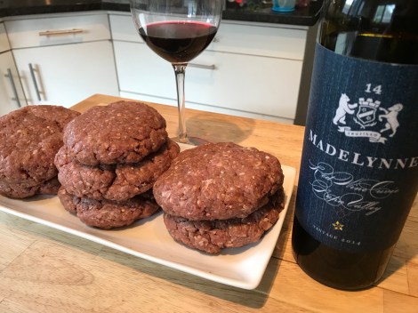 I pulled a large mixing bowl from the lower reaches of our kitchen shelving and tossed in three pounds of raw hamburger, Gates BBQ sauce, onion powder, garlic salt, Sandhills seasoning, and some blood orange bitters. I removed my wedding ring, rolled up the pretty white sleeves of my long-sleeved Harvard tee shirt, and began massaging the concoction into submission. A few inches away and at the ready, a bottle of Madelynne, one of my favorite red blends, sat erect, uncorked and at attention, ready whenever I was. I didn’t make her wait long.